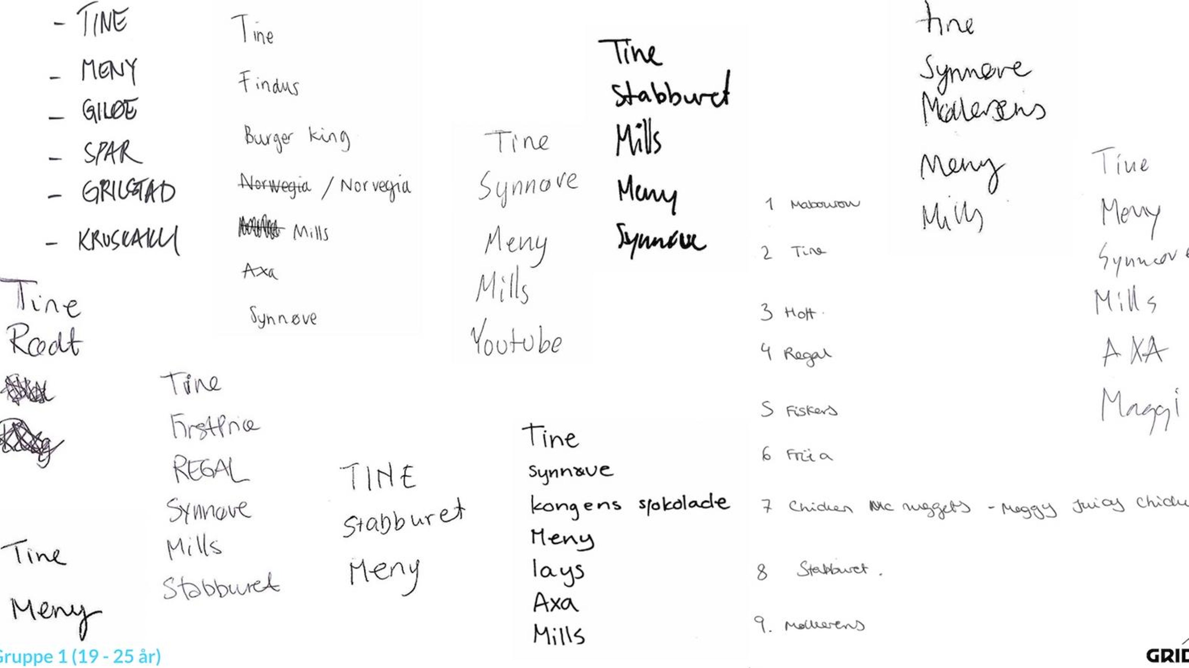 Det var også stor variasjon i antallet som ble identifisert. En kjente kun igjen Tine, og en førte opp 19 navn. Noen kjente igjen merkevarer som ikke var der. Og et par respondenter skrev at de kjente igjen fler, men husket ikke navnet. De fleste svarene ligger på et sted mellom fem og 10 merkenavn.