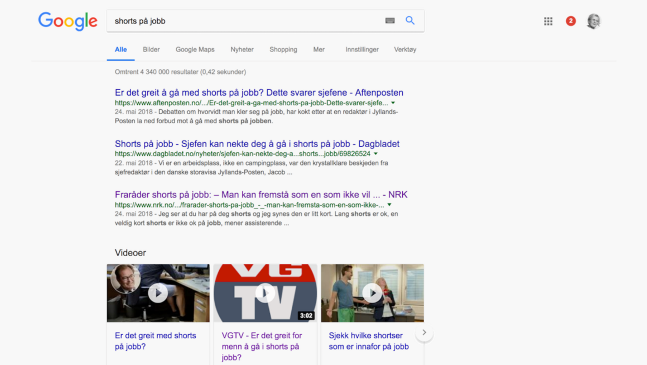 Dersom du Googler "shorts på jobb" får du mer enn fire millioner treff. Jeg skrollet raskt gjennom de ti første sidene, og nesten alt var medieoppslag fra mai i år om debatten rundt shorts på jobben.