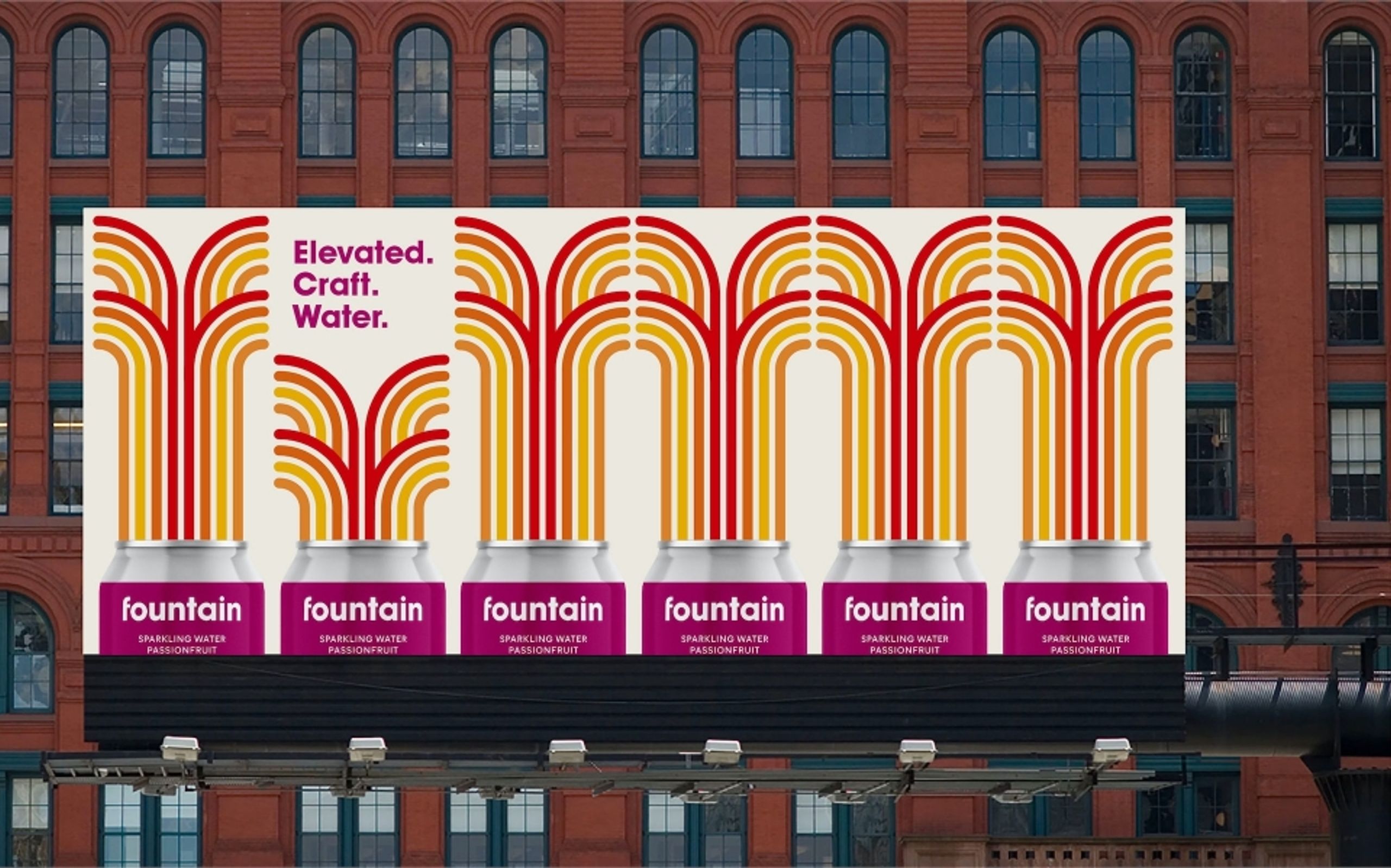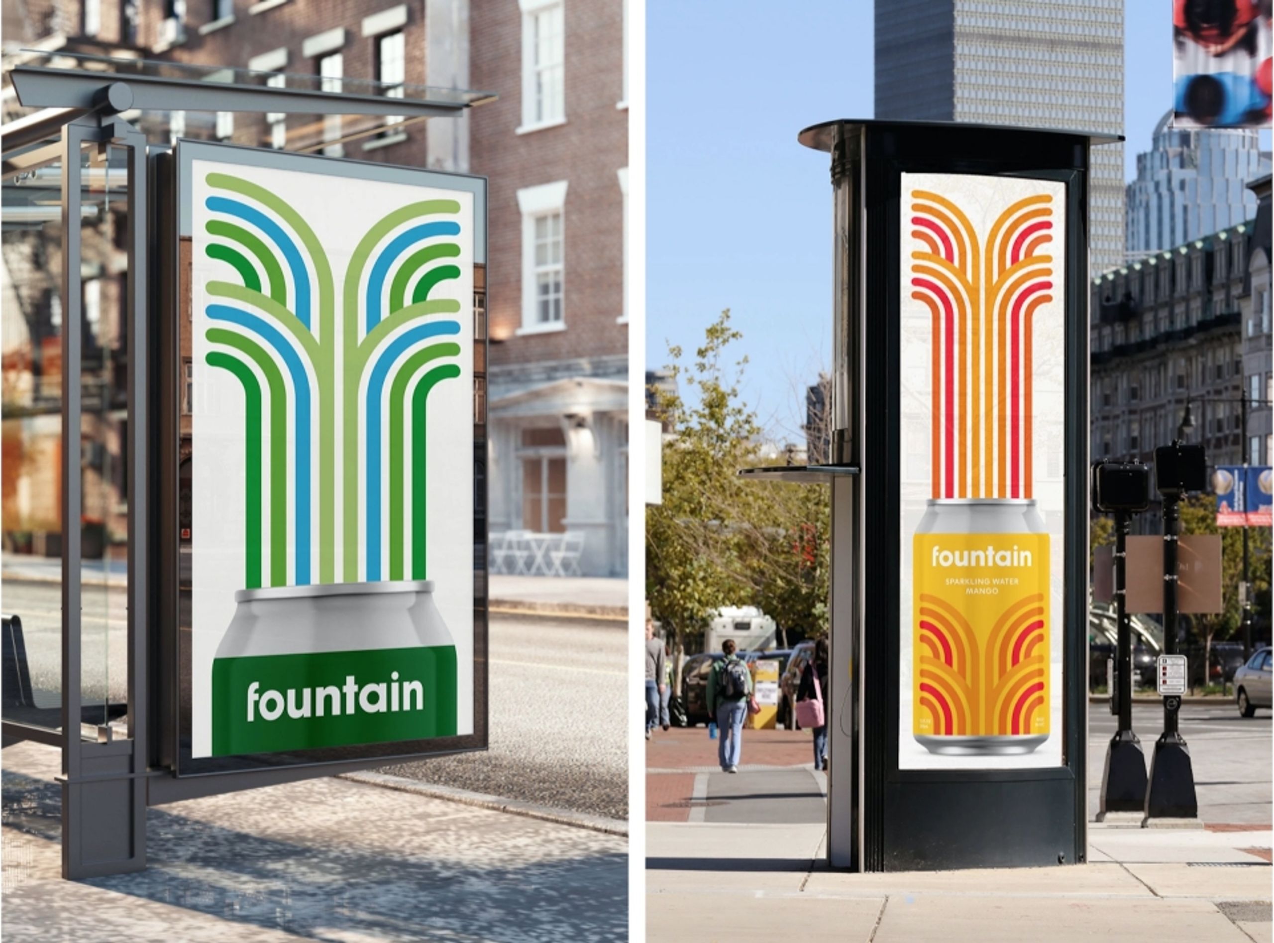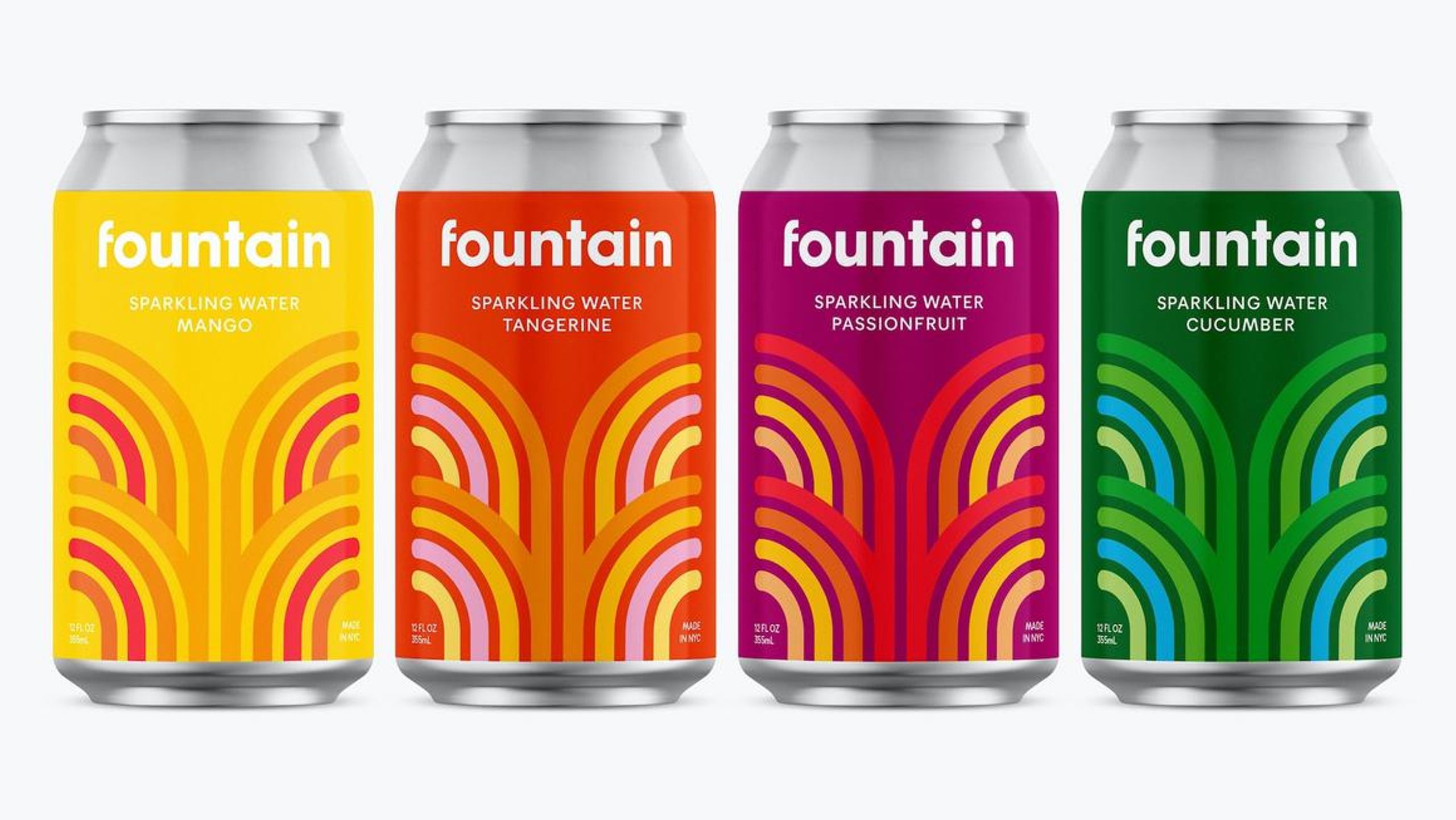 Fra Pentagrams casebeskrivelse: Fountain kombinerer to trender innen sunn livsstil: 1) Egenskapene til CBD (cannabidiol) produkter driver et eksploderende marked som forventes å nå 15 billioner dollar innen 2025. 2) Kullsyreholdig smaksatt vann er en av de hurtigst voksende kategoriene innen drikkevarer, med en omsetning på 2,45 billioner dollar i 2019.