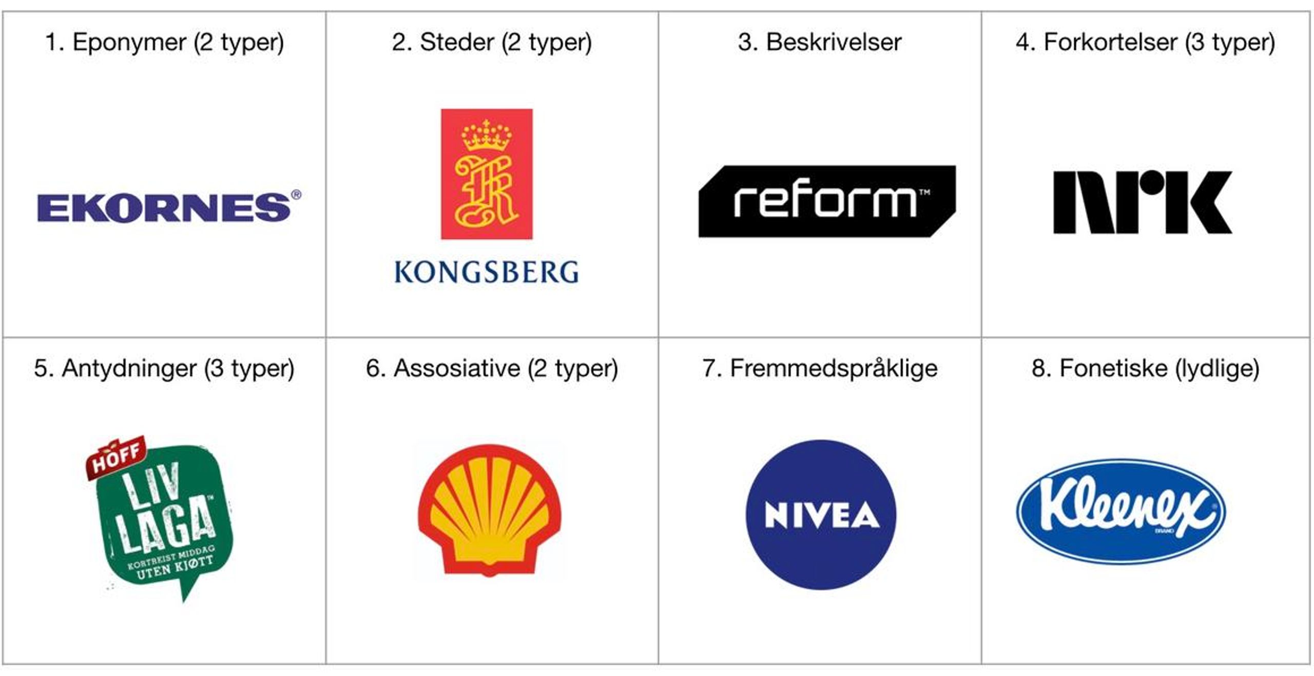 Les også innledende artikkel: All verdens merkenavn er plassert i 8 kategorier