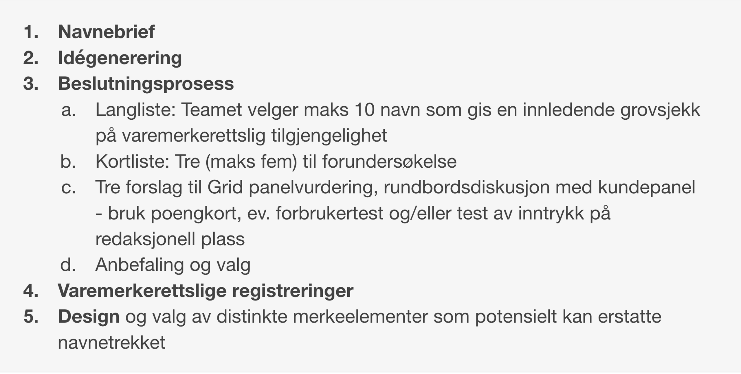 Grids navneprosess i en forenklet fem-punkt-liste. Design er med fordi det er nyttig at teamet som har jobbet frem navnet er med innledningsvis i designprosessen med innspill til det kreative konseptet og idéer til mulige merkemarkører.