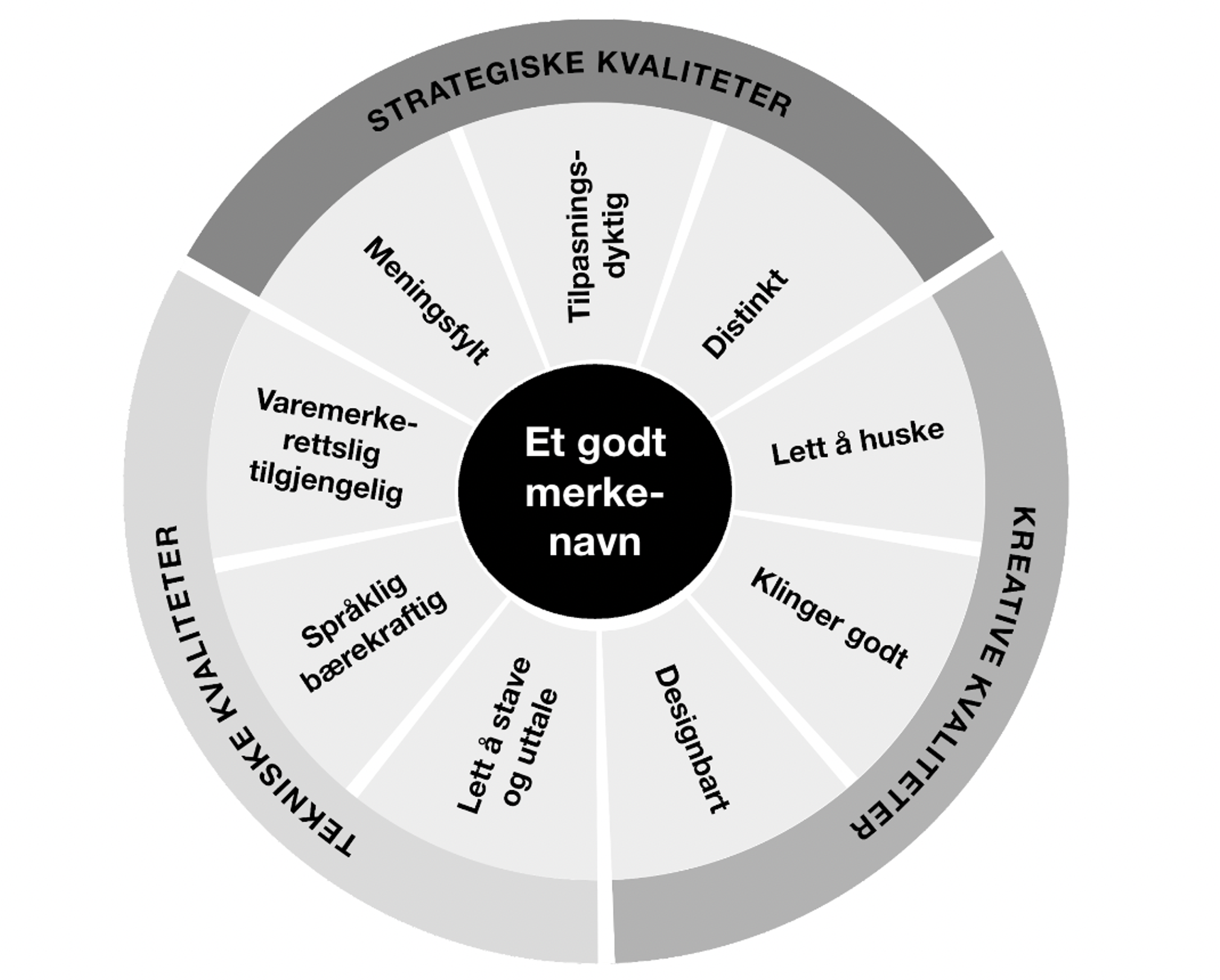Vi deler kravene til et merkenavn i ni kvaliteter fordelt på tre områder: Strategiske, kreative og tekniske kvaliteter. Selv et fantastisk godt navn vil ikke skåre 100% på alle ni. Det er derfor hensiktsmessig og først gjøre et utvalg (3-6) og så prioritere de.