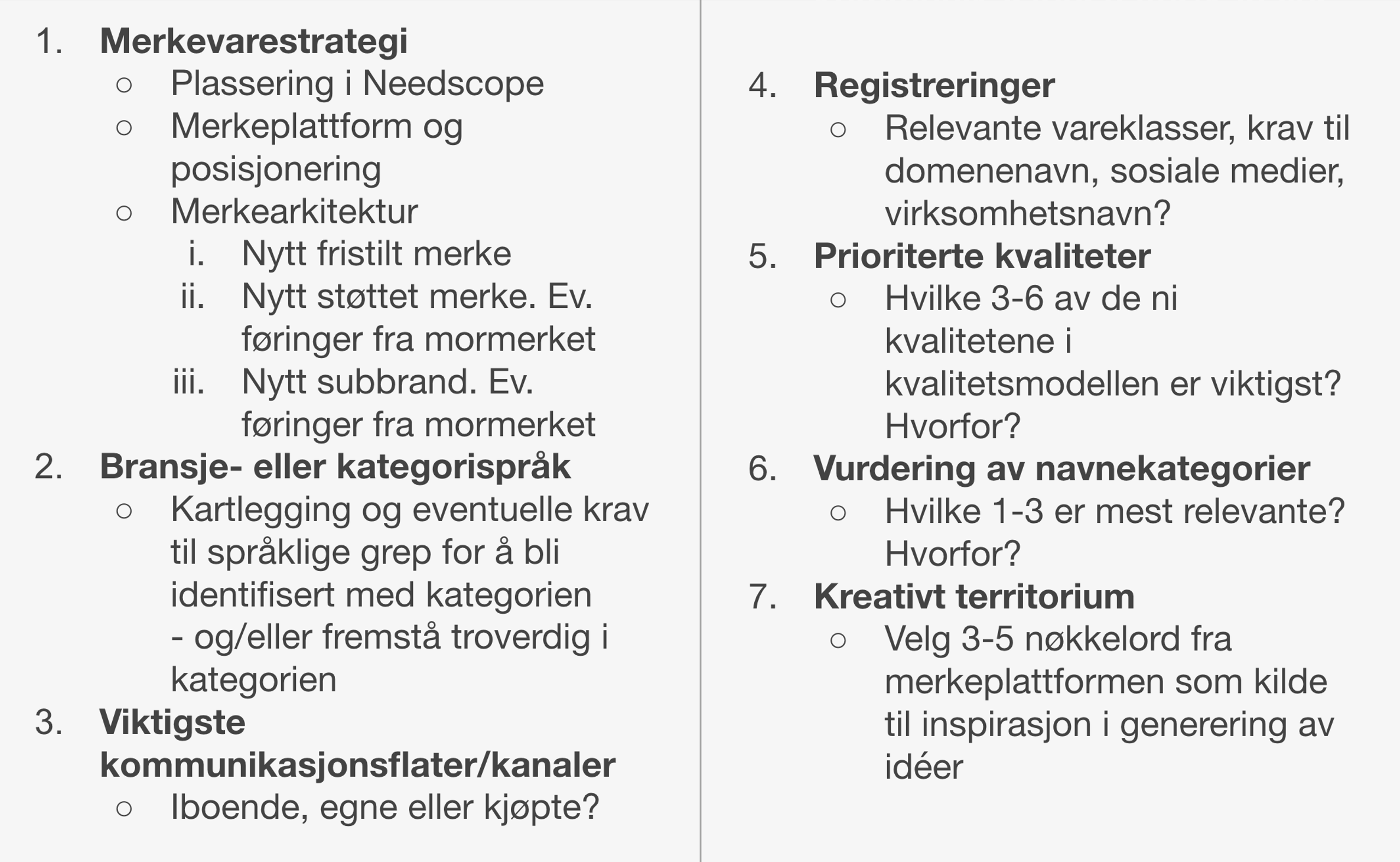 Navneprosessen kan enkelt deles i fem steg. Jo mer gjennomarbeidet brifen er jo større er sjansen for å finne det navnet som lar seg registrere - og ikke minst lar seg designe på en måte som forsterker merkennavnet, altså merkevarens posisjonering (meningsfullt annerledes) og personlighet.