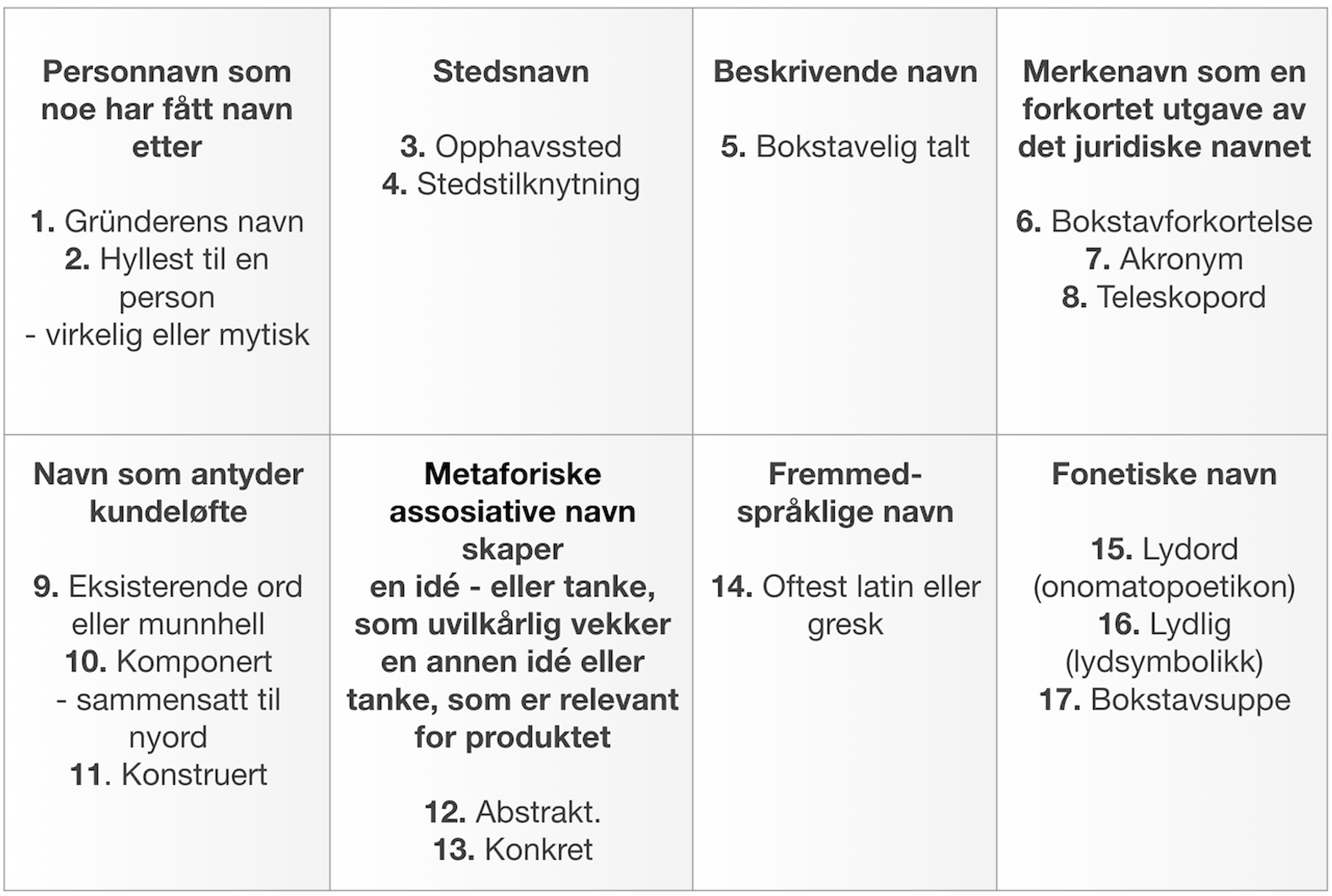 Vi kan dele merkenavn inn i totalt 17 kategorier når vi tar med underkategoriene. Og mange navn kan plasseres i flere kategorier.