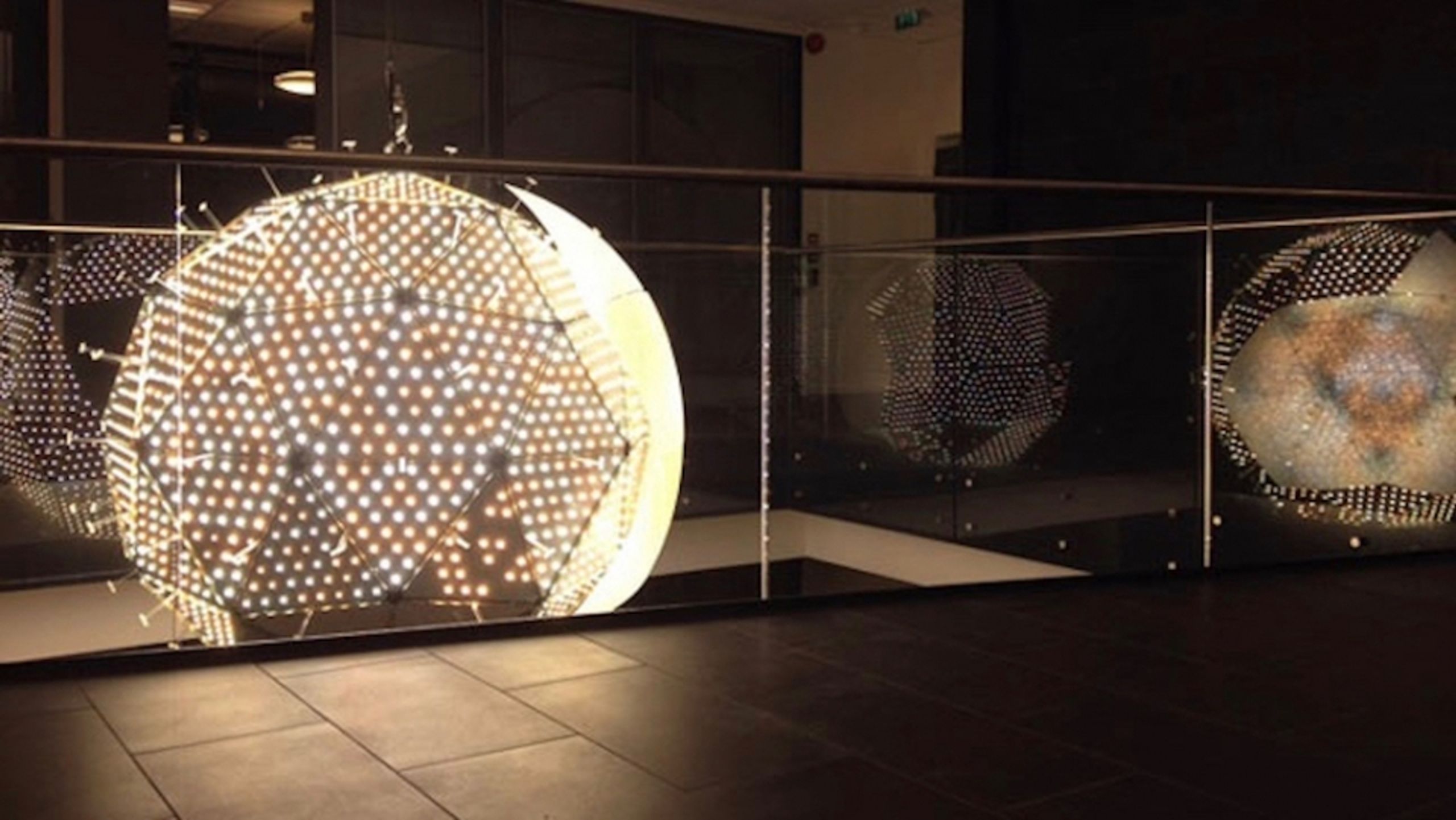 Diameteren på sfæren er 1,8m, og skifter lystemperatur (varm- og kaldhvit) lik solens overflate samtidig som den beveger seg sakte opp og ned i bygget. Lyssensorer gjør at allmennbelysningen justeres i takt med bevegelsen. Det var et komplisert og gøy prosjekt sier Anders. Se film under.