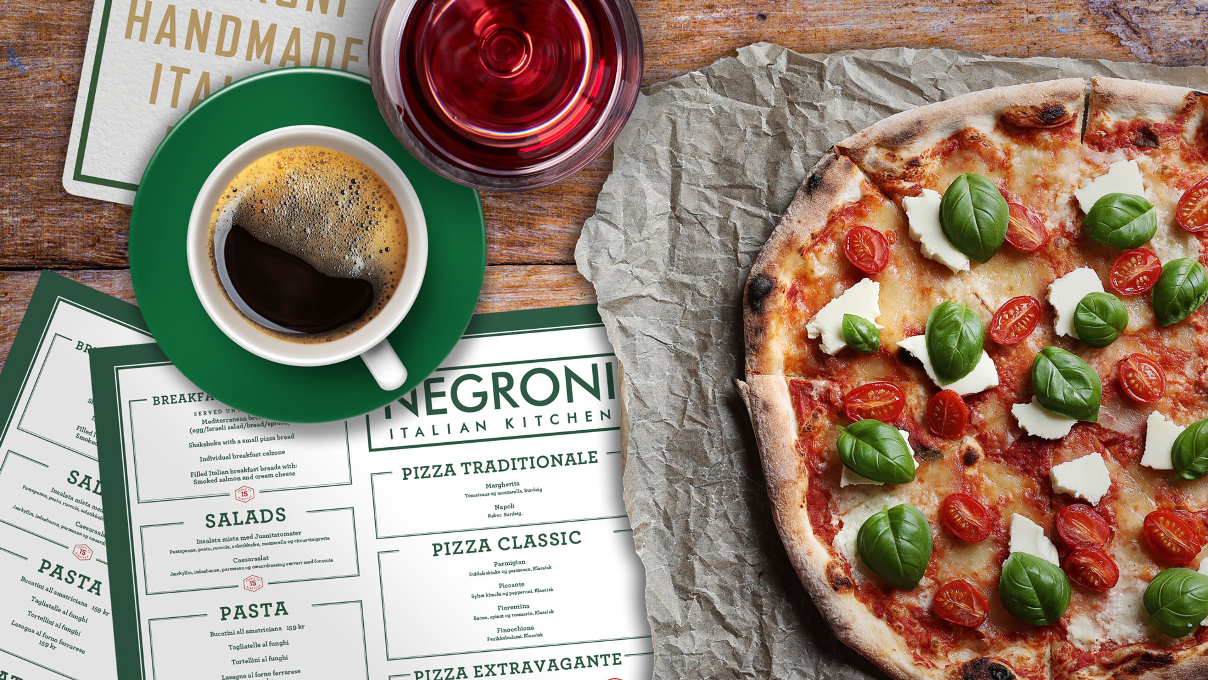 Negroni serverer alt fra nykvernet kaffe og bakverk om morgenen, sharing plates med skinke og ost til perfekt bakte pizzaer og deilige pastaer om ettermiddagen og kvelden.