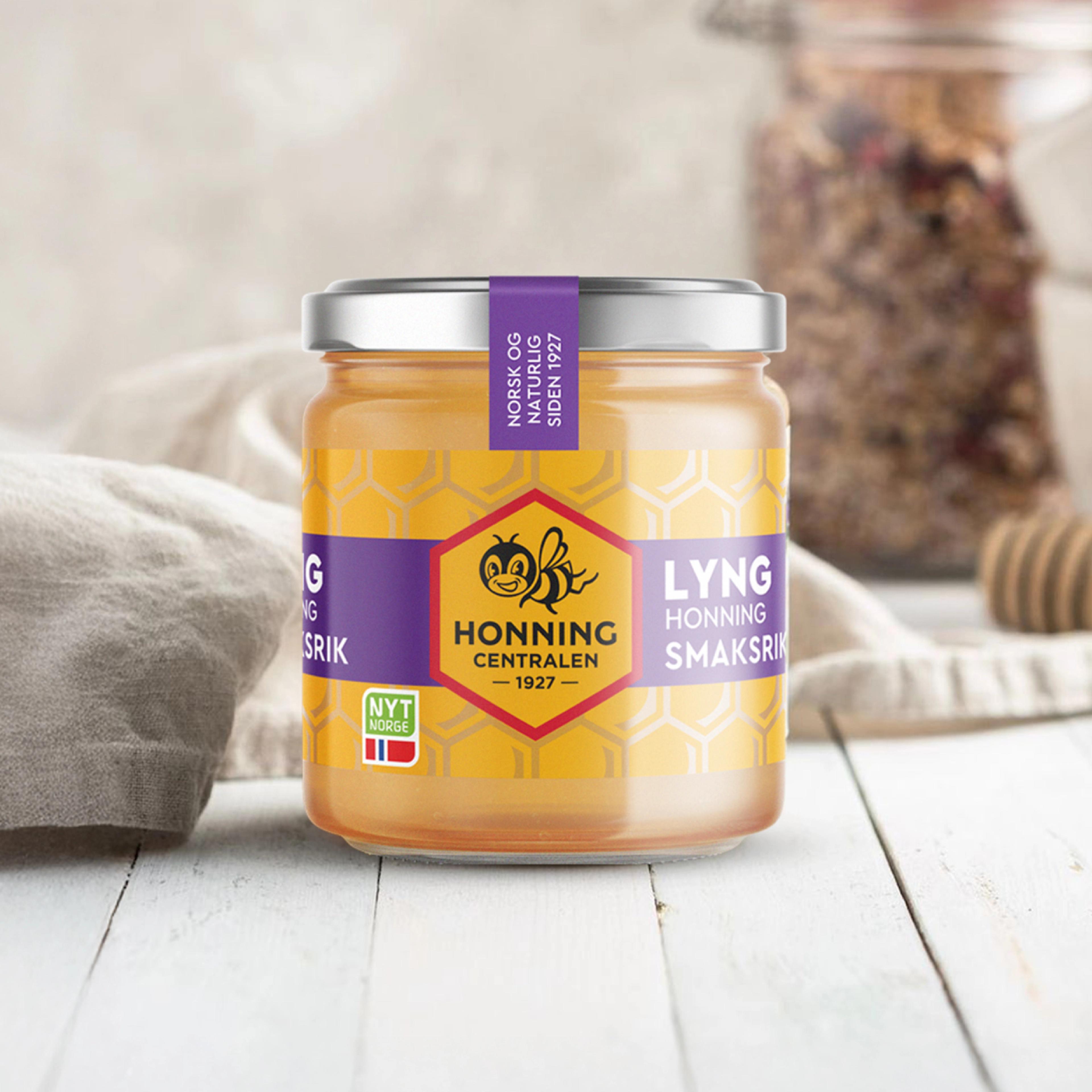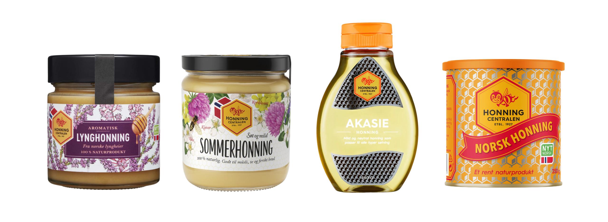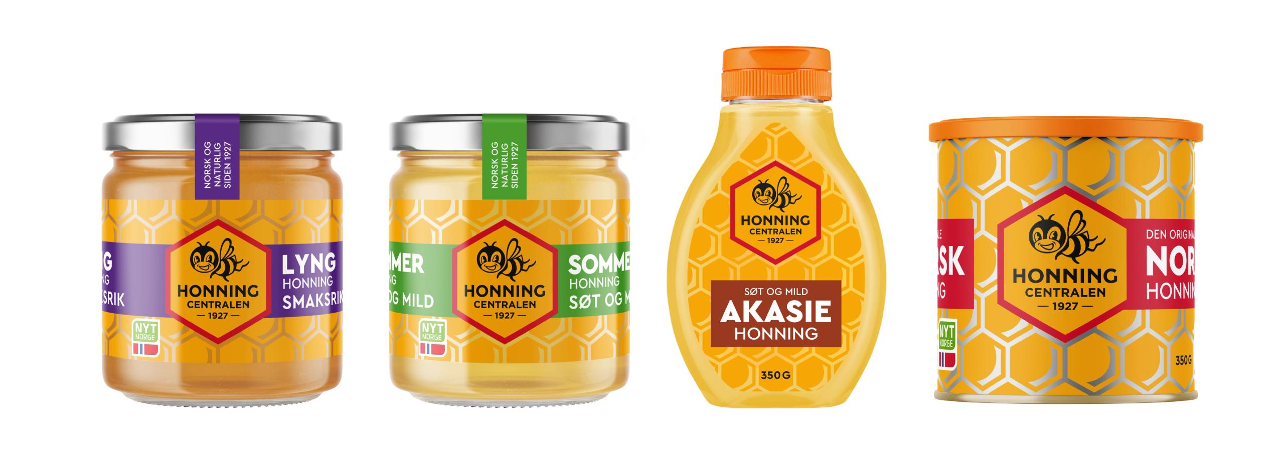 De øvrige variantene – Sommerhonning, Lynghonning, Akasiehonning og Fjellhonning – fikk alle et tydelig designmessig slektskap til Norsk honning. Selv om de kommer i ulike emballasjetyper – glass, plast eller metall – er det ingen tvil om at de tilhører samme merkevare.