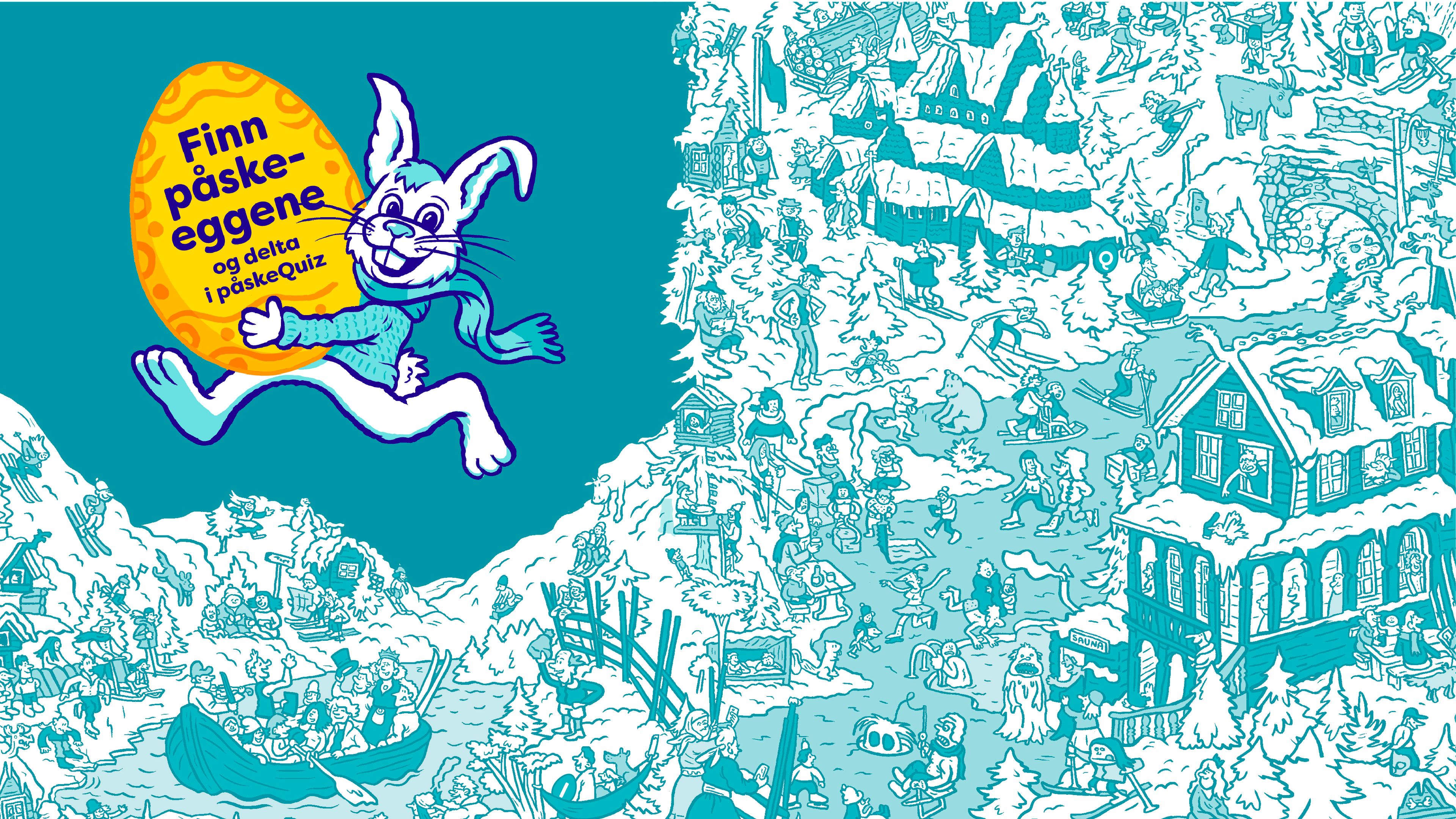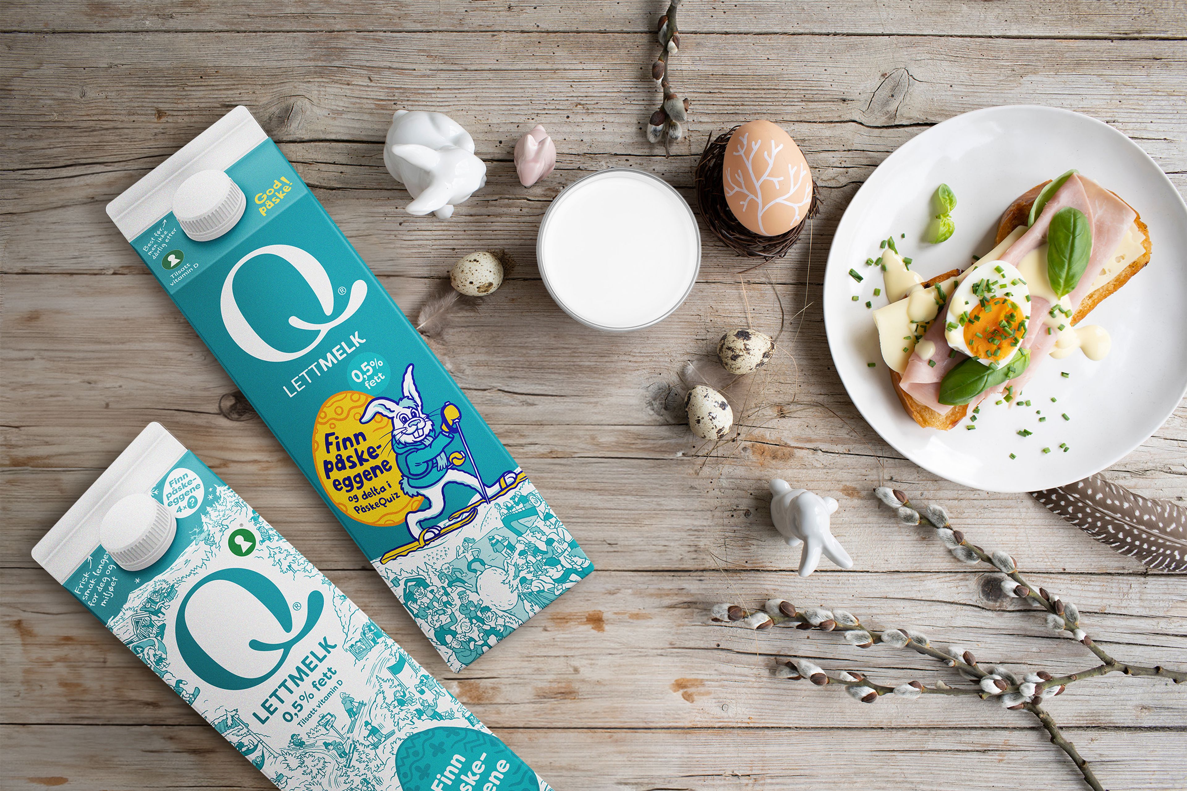 Siden 2017 har vi, i samarbeid med Q-meieriene, skapt påskemoro i pakningsdesignet gjennom myldreillustrasjoner inspirert av «Where’s Waldo». Her kan små og store lete etter påskeegg i ikoniske, norske påskemiljøer. I 2022 fikk Q-påskeharen sin faste plass i designet, og påskegleden har nå spredt seg digitalt med interaktive quizer som knytter seg til kartongen.