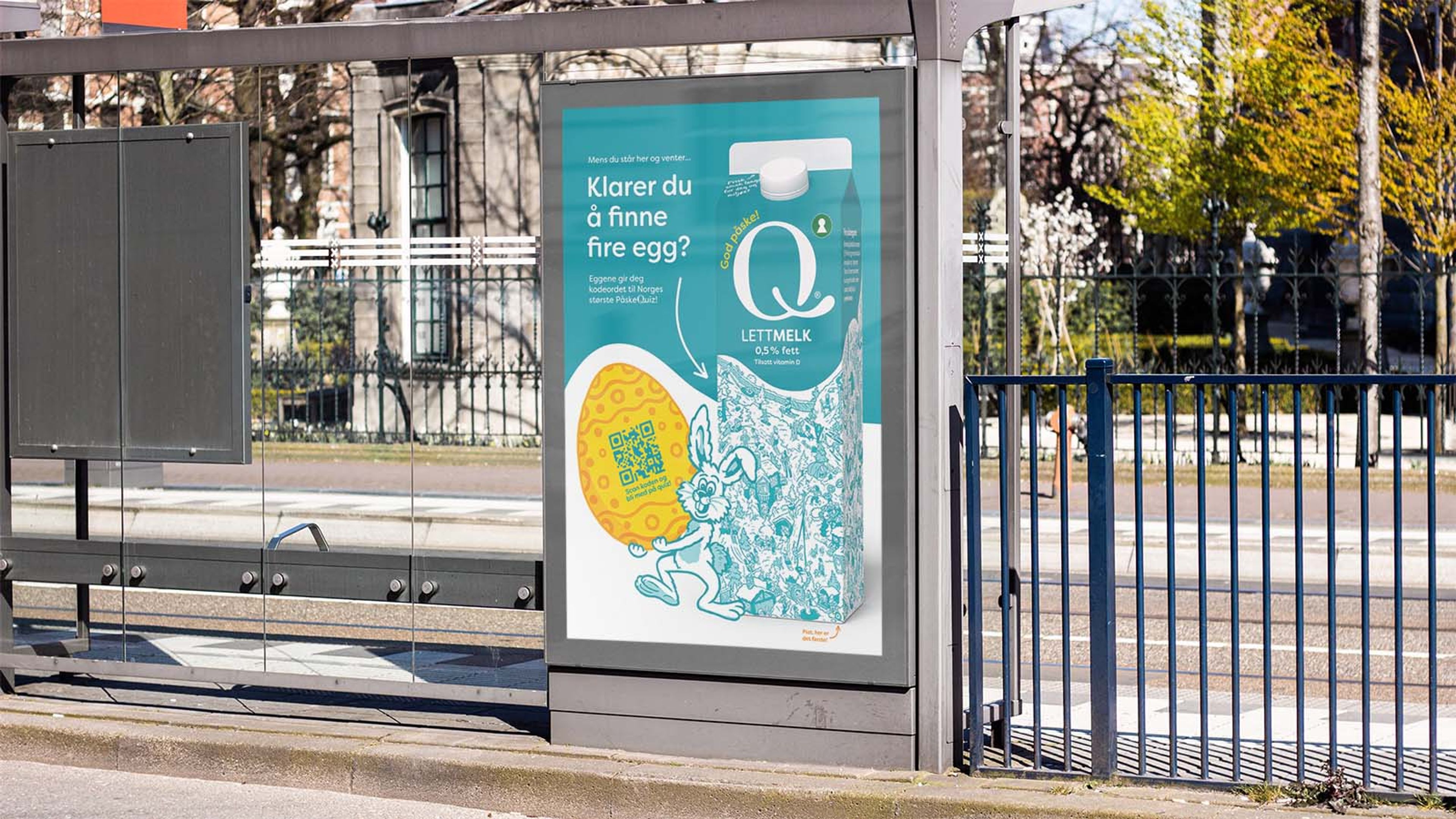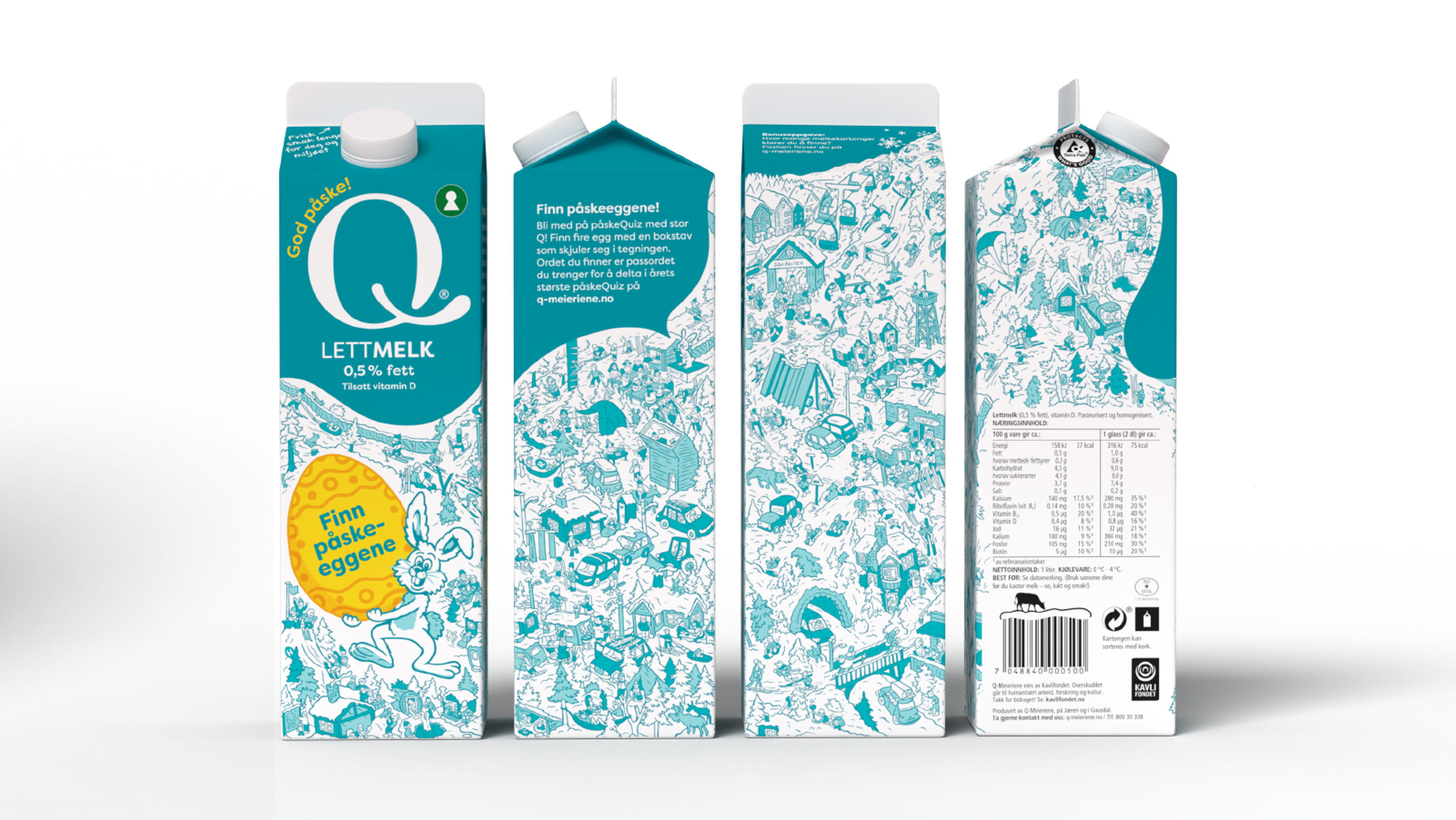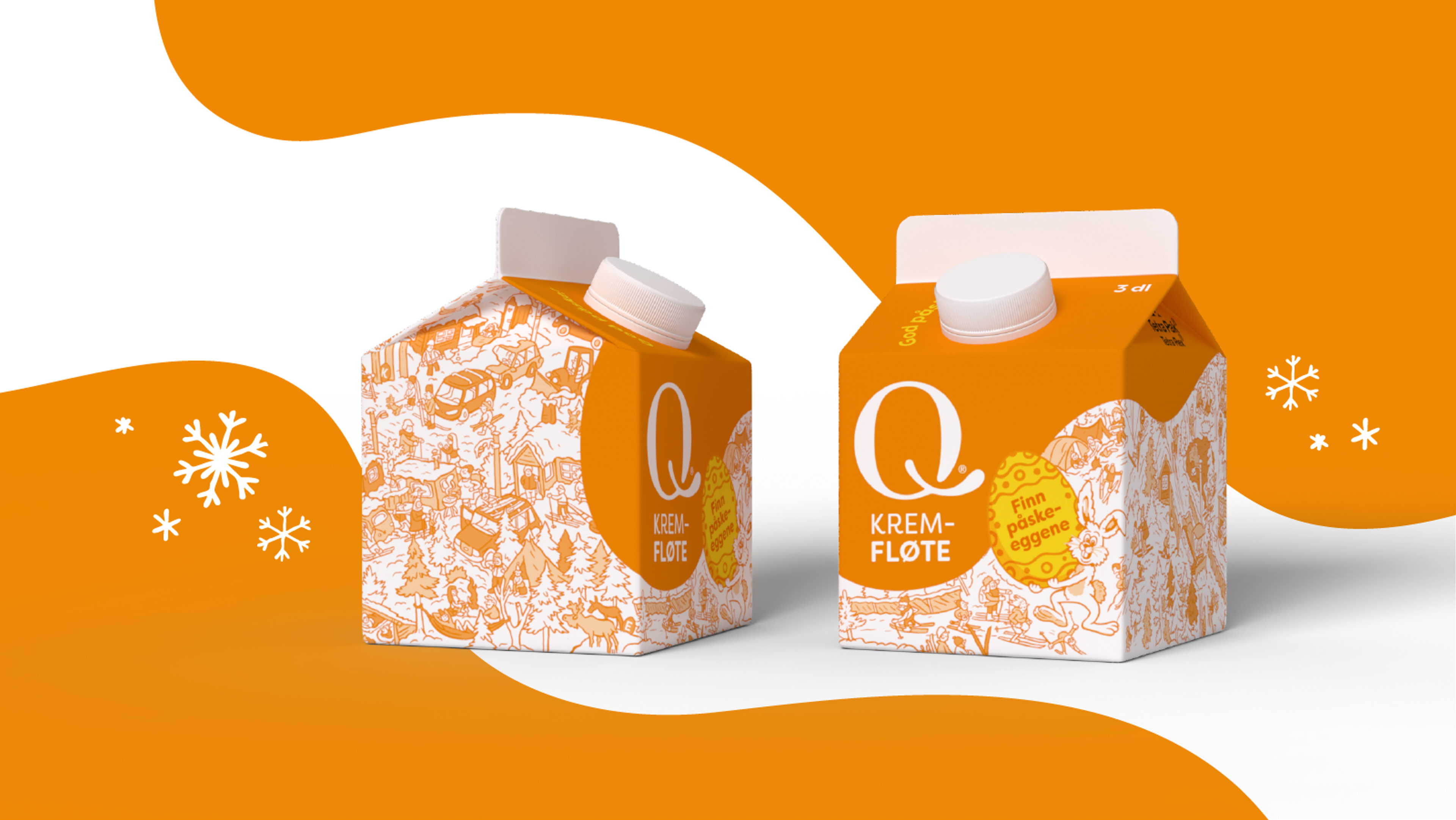 - Utvikle et design som gir en engasjerende jakt på påskeegg i myldreillustrasjon på pakning og spesialdesignet kampanjeside (digital løsning, online quiz), samtidig som Q-melk og Q-fløte er lett gjenkjennelige i butikken.