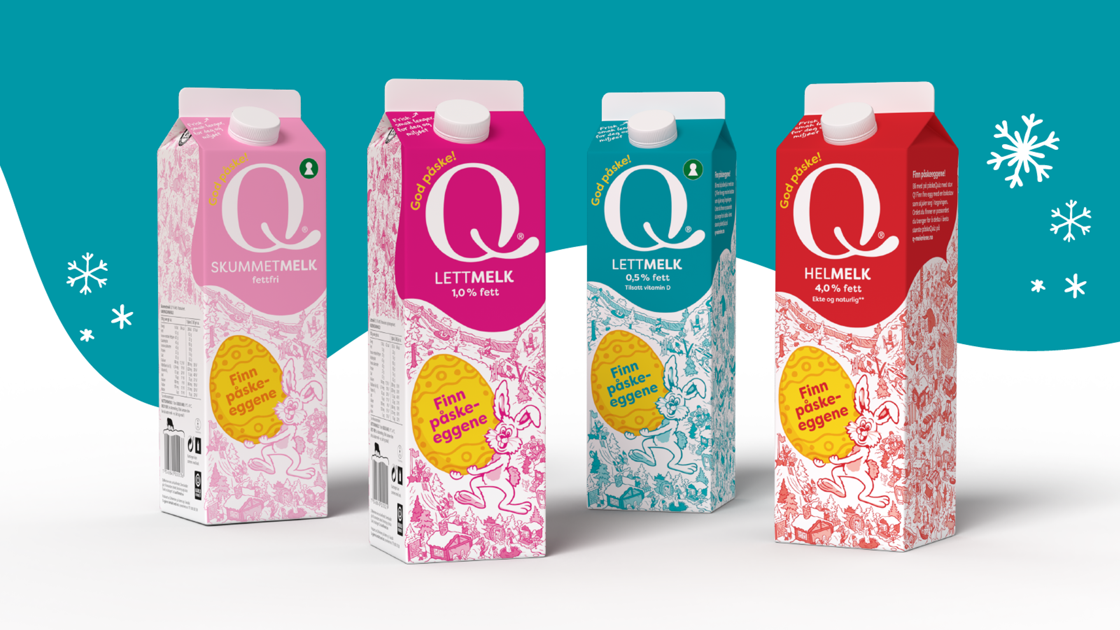 Ett av målene da Grid utviklet en ny visuell identitet for hele porteføljen av Q-meierienes melk og matlagingsprodukter i 2020, var å gjøre merkevaren Q mer gjenkjennelig på tvers av produktkategorier. En forutsetning for årets påskekartong var derfor at denne avviker mindre fra helårs-designet.