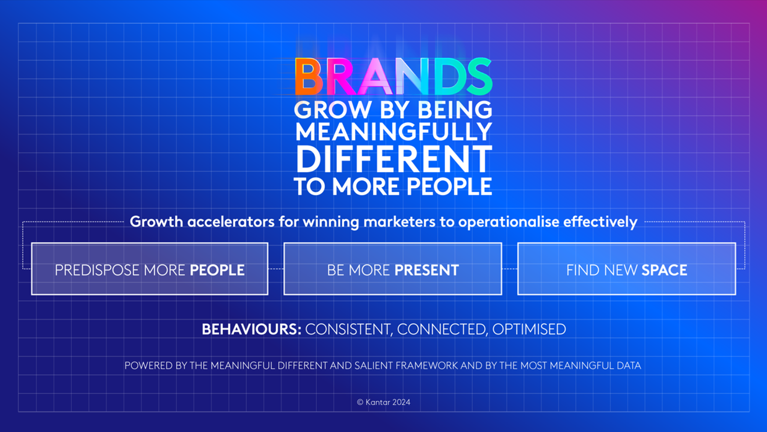 Blueprint for Brand Growth oppsummerer hvordan merkevarer kan vokse gjennom å være Meaningfully Different to More People og tre vekstakseleratorer. (Kantar 2024)