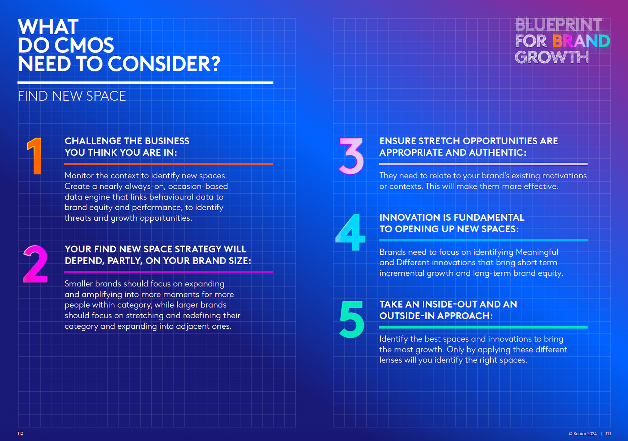 Fem sentrale vurderinger for merkevarer som vil finne nye rom for vekst – fra å utfordre kategorien de er posisjonert i til å identifisere muligheter for innovasjon (Kantar, 2024).