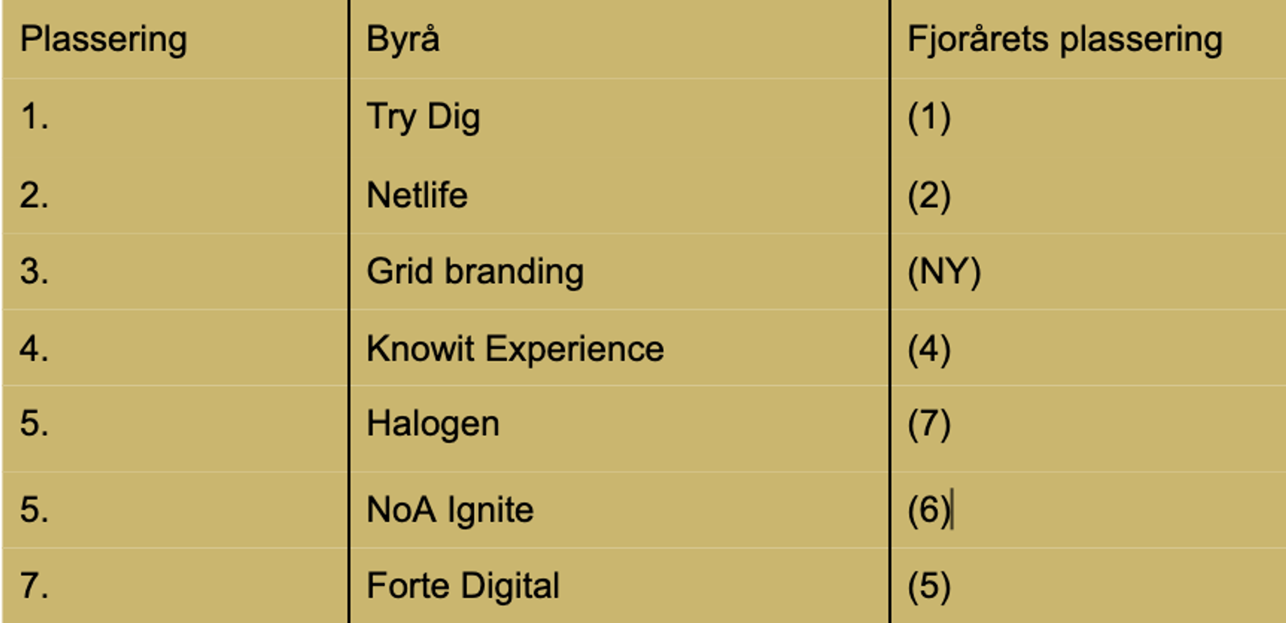 Takk til alle som har stemt oss frem. Og gratulerer til Try Dig med hat-tricket, samt Netlife og de andre byråene på listen.