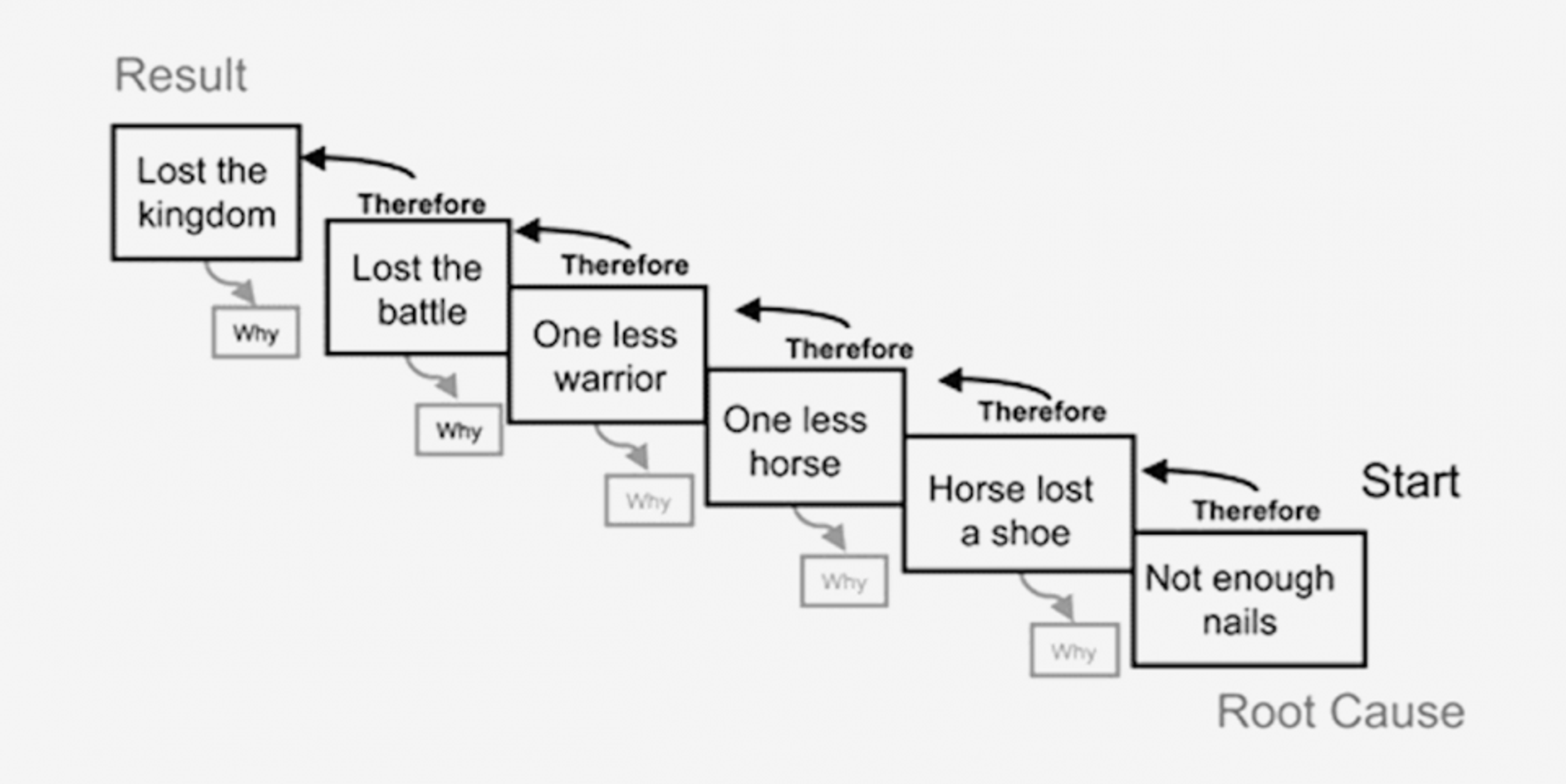 Goggler du the 5 whys examples får du mer en 50 millioner resultater. Og moralen er; ikke fiks symptomet. Løs problemet.