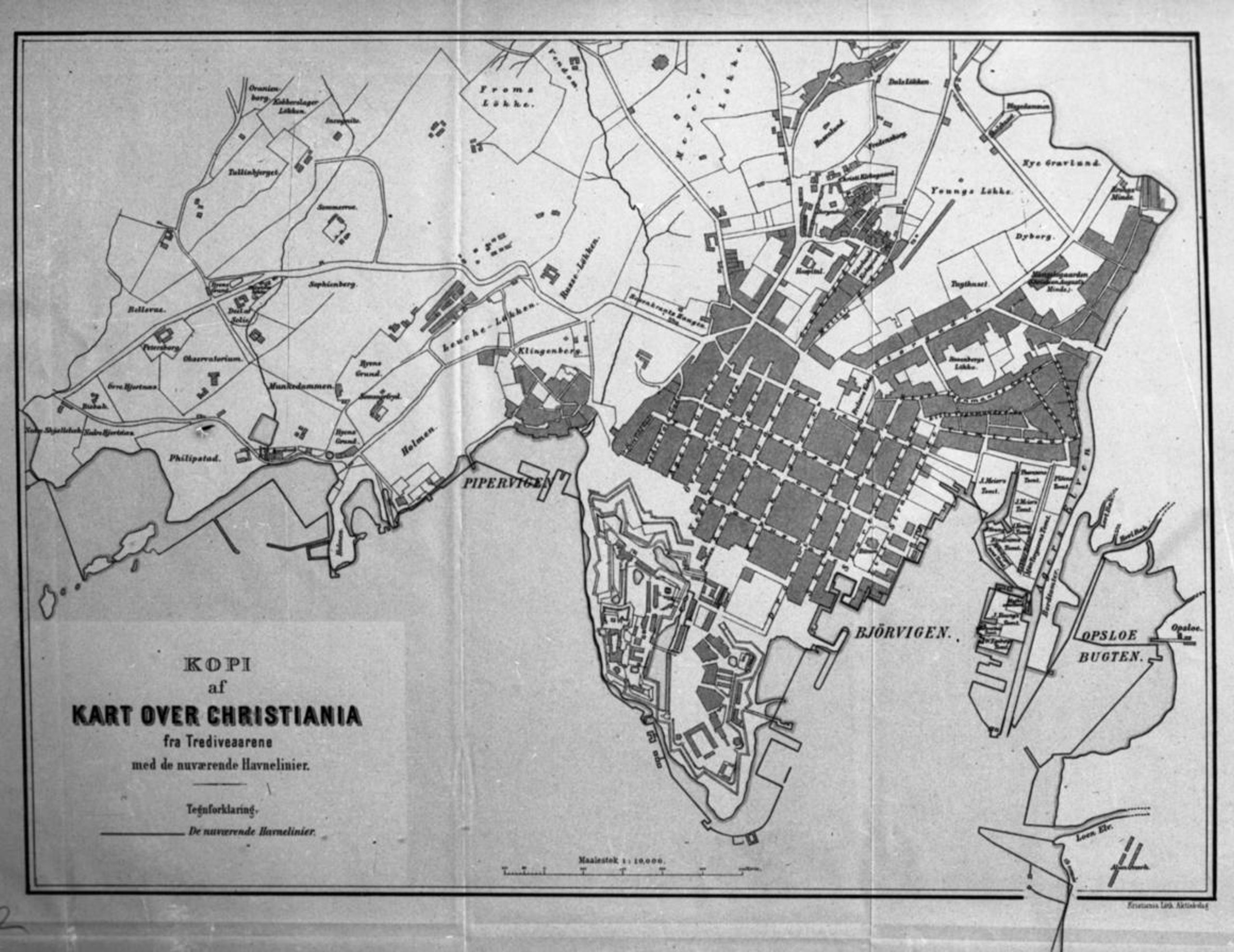 Christiania på kart fra 1830 med «Opsloe-bugten» avmerket øst for Akerselvas utløp.