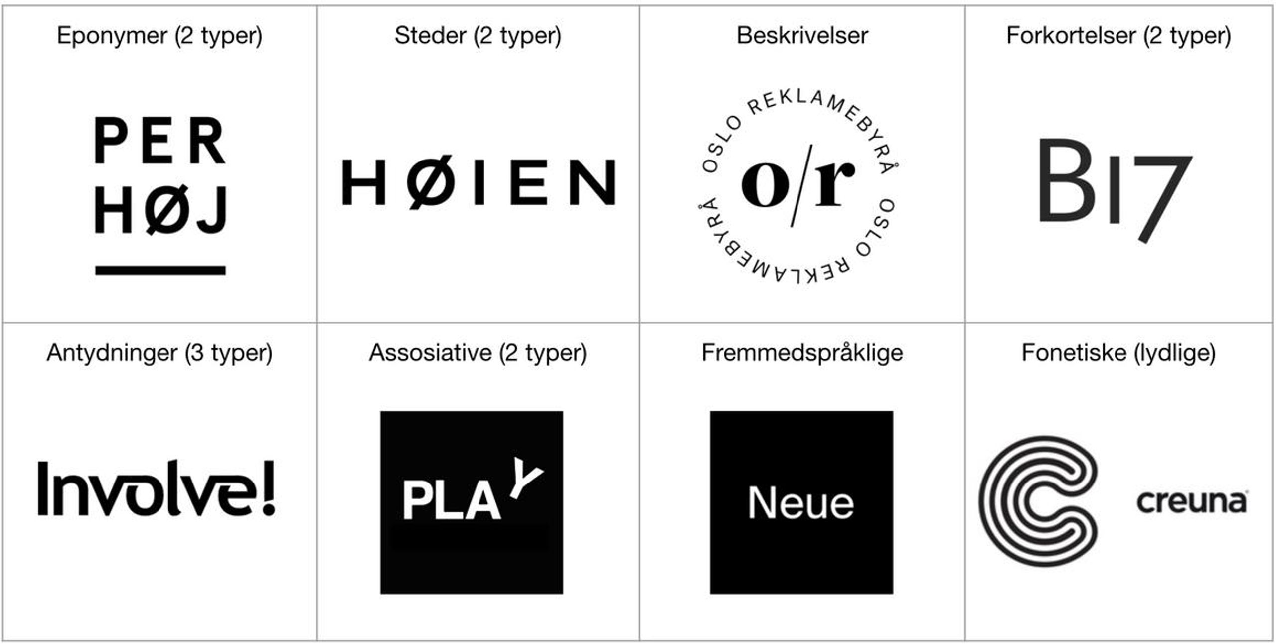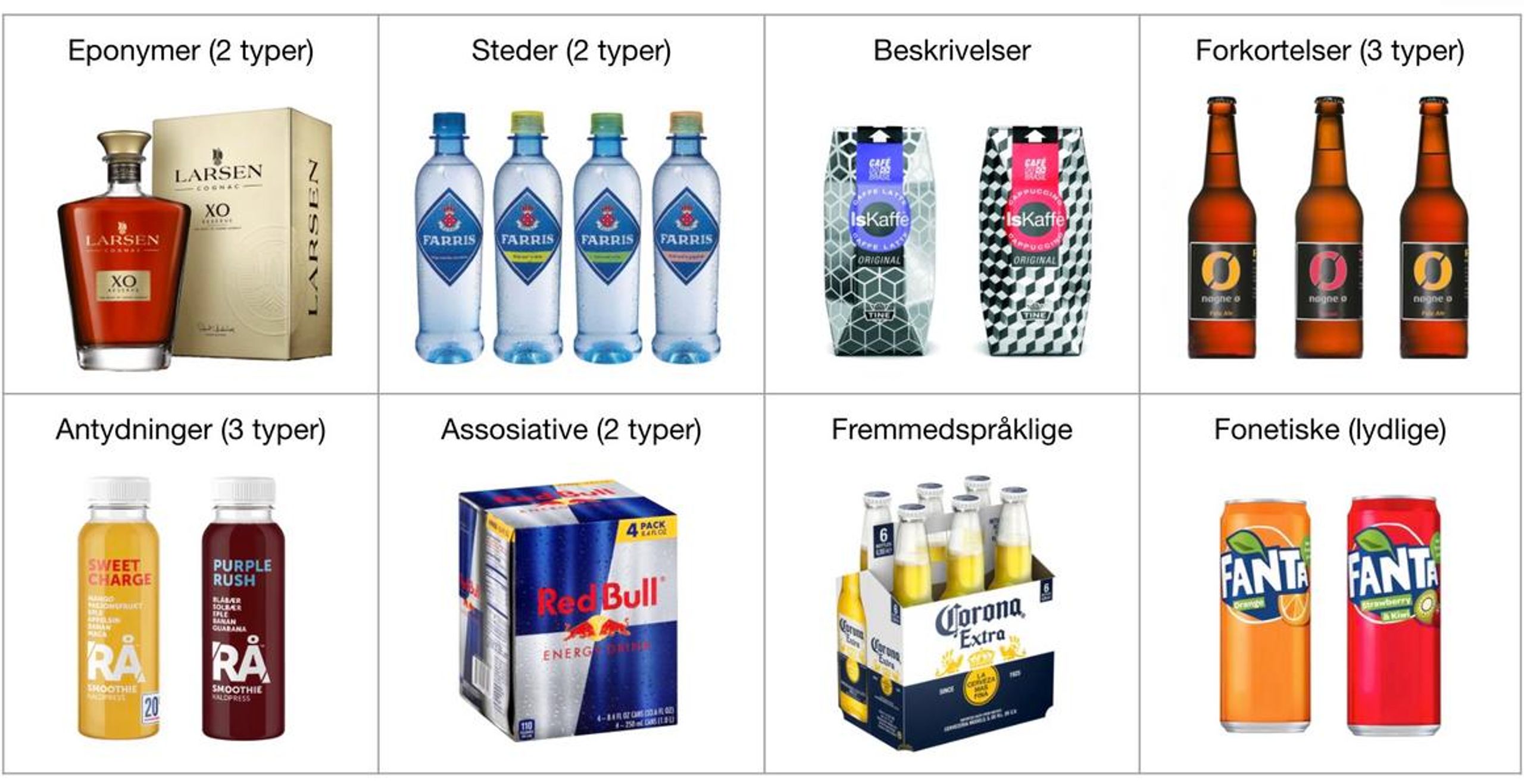 Totalt snakker vi om 17 kategorier, når vi tar med underkategorier, som du kan plassere merkenavn i. Og mange navn kan plasseres i flere kategorier.