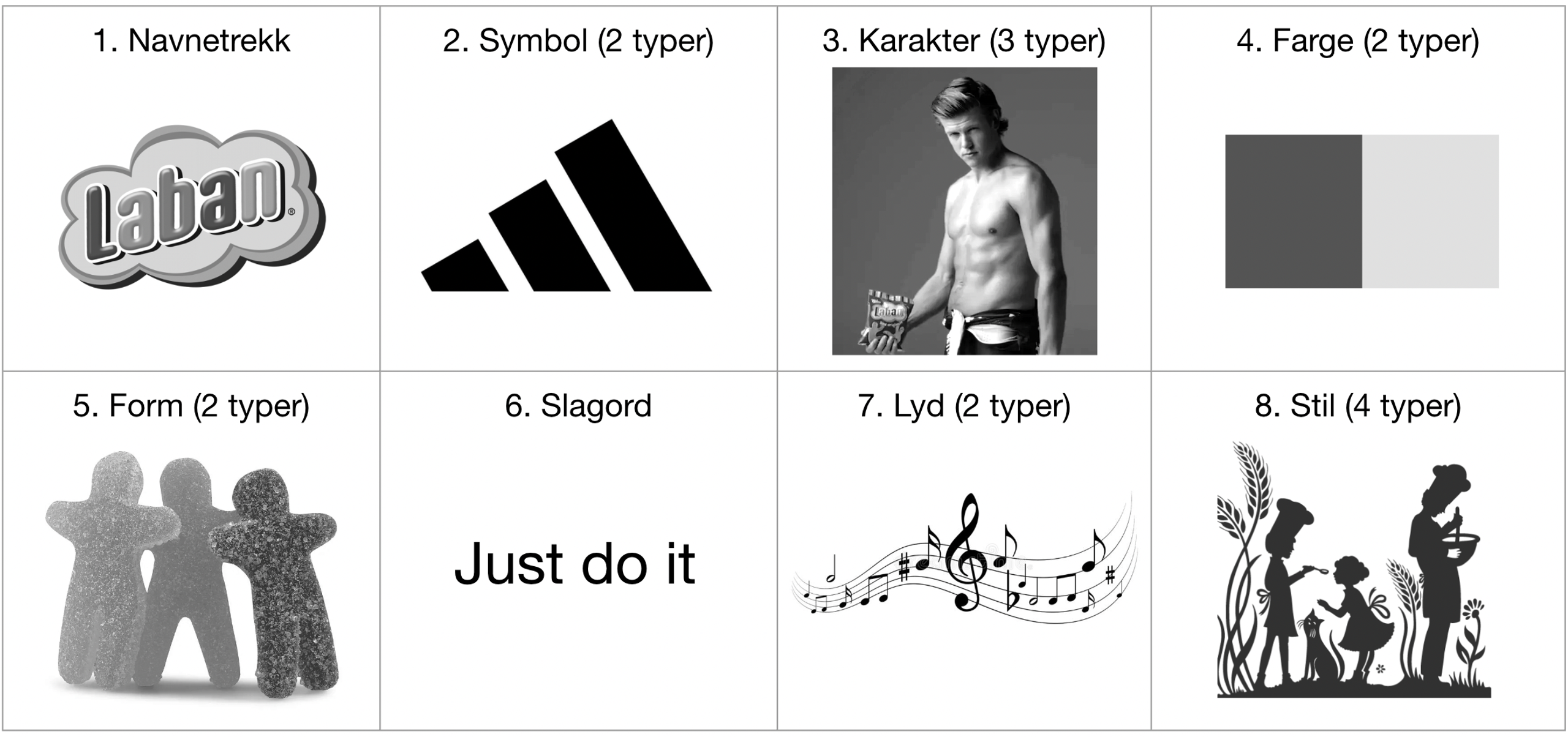 8 kategorier merkeelementer: Totalt har vi 17 kategorier når vi tar med underkategoriene. Og mange merkeelementer kan plasseres i flere kategorier.