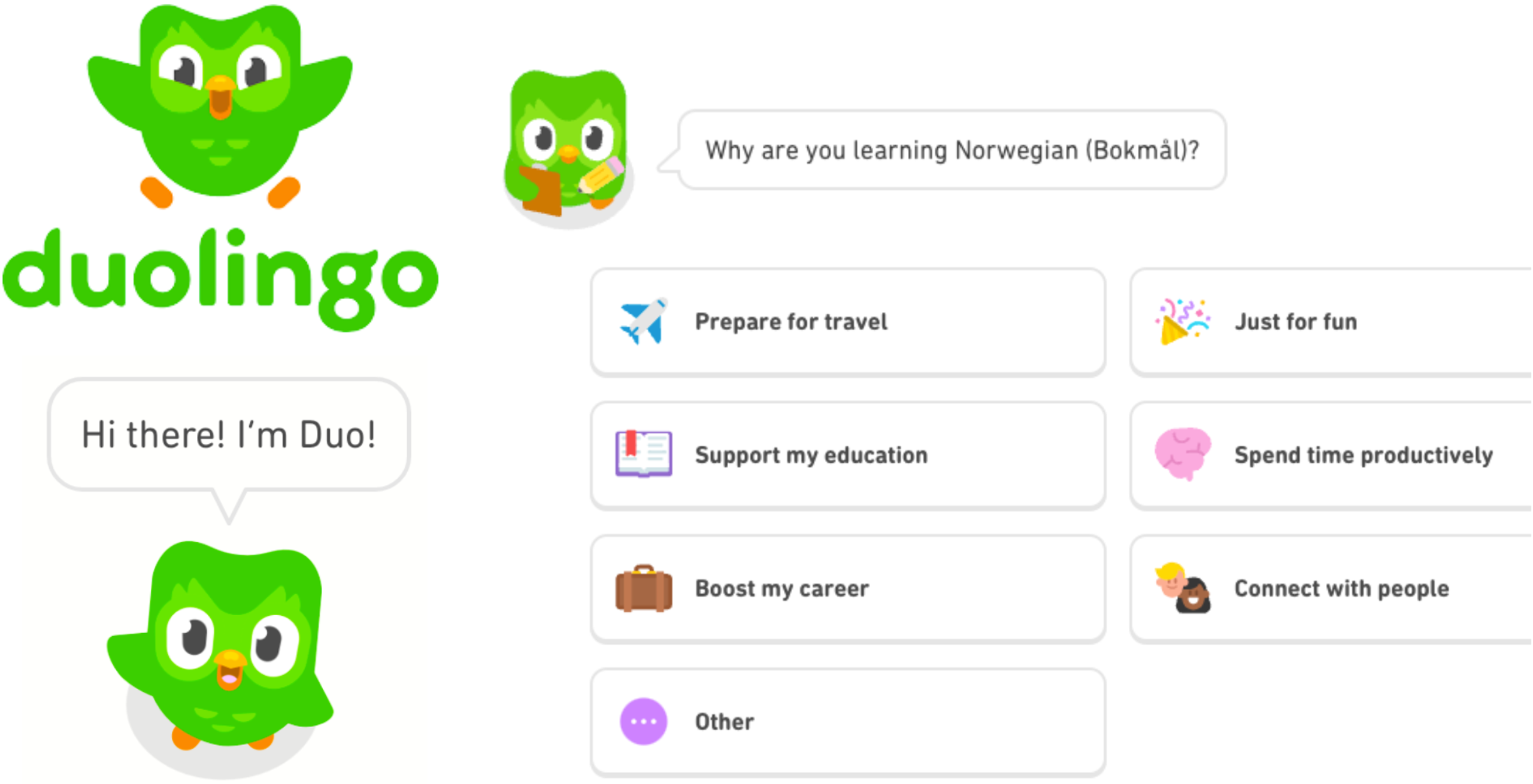 Lær et nytt språk med Duo: Duolingo, og maskoten Duo, gjør det morsomt å lære seg et nytt språk. Last ned appen og øv akkurat når og hvor det passer deg - eller sjekk duolingo.com.