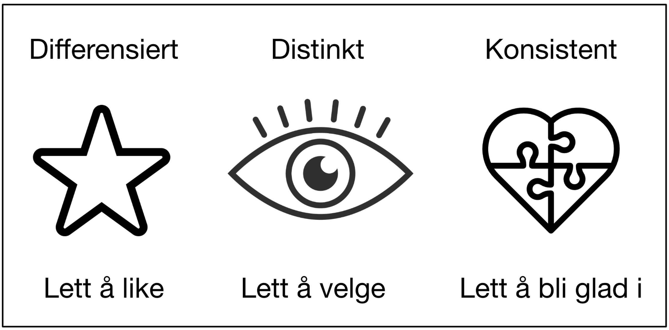 Når en merkevare er differensiert, distinkt og konsistent, blir den effektivt sterkere over tid. Den blir lett å oppdage, lett å forstå, lett å like, lett å gjenkjenne, lett å velge – og i sum, lett å bli glad i.