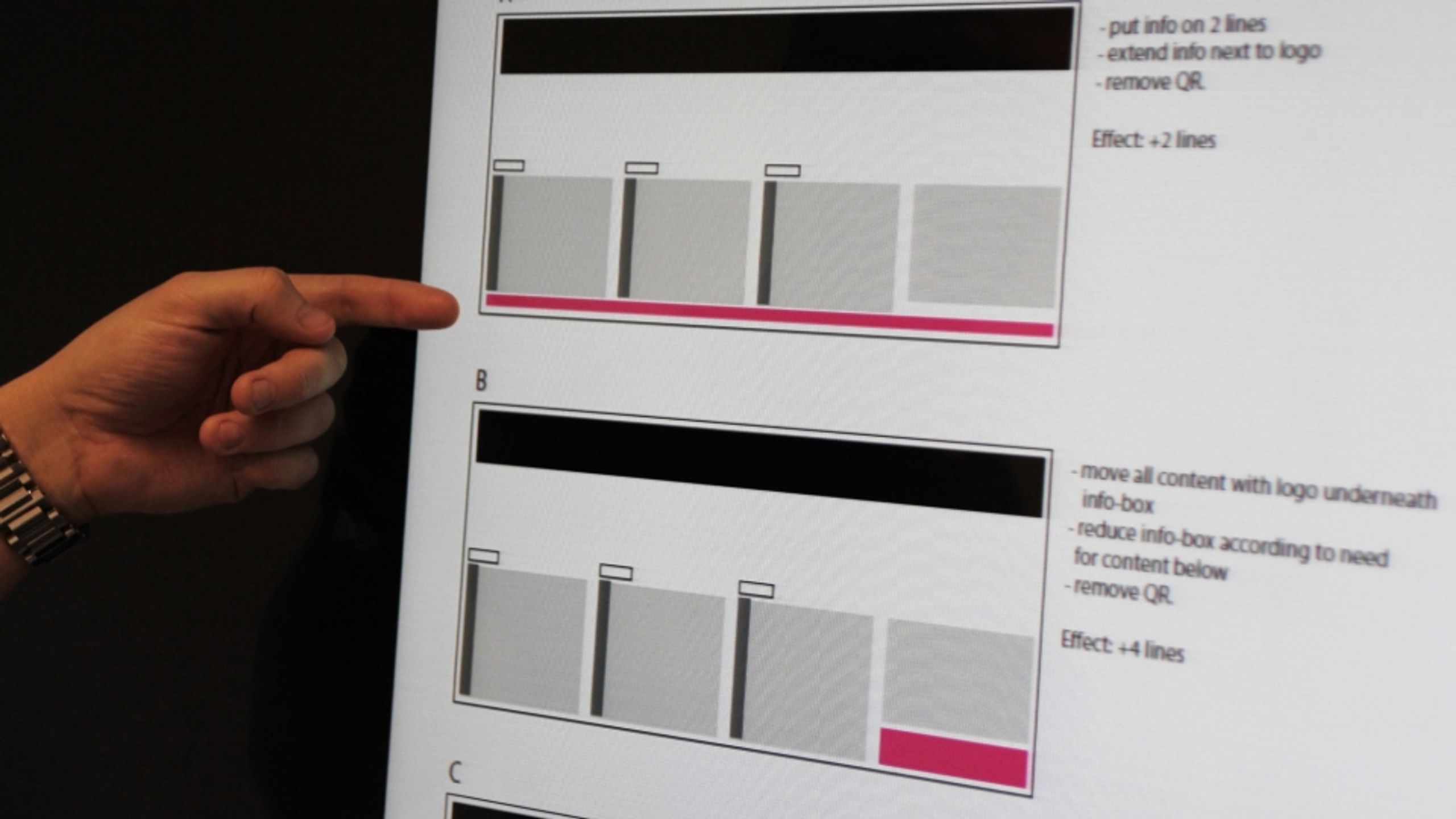 Her peker Christian eksempelvis på ulike versjoner av stoppestedstabellen skissert for å diskutere optimal plassering av innhold i forhold til hva som vil gi maksimal plass.