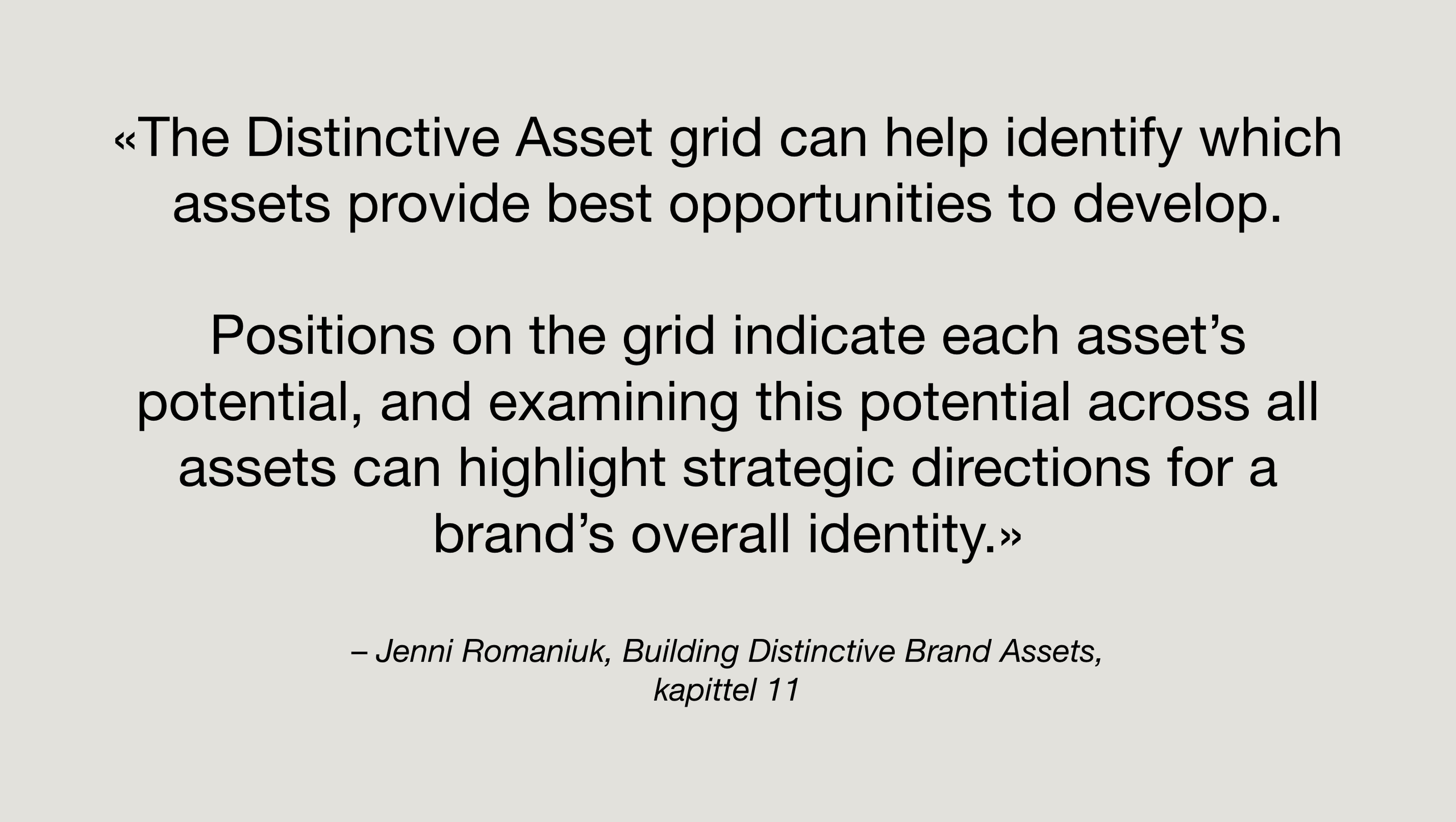 Kapittelet introduserer The Distinctive Asset grid som et strategisk verktøy, og viser hvordan målingene av kjennskap og graden av unikhet kombineres for å vurdere styrken i et merkeelement.