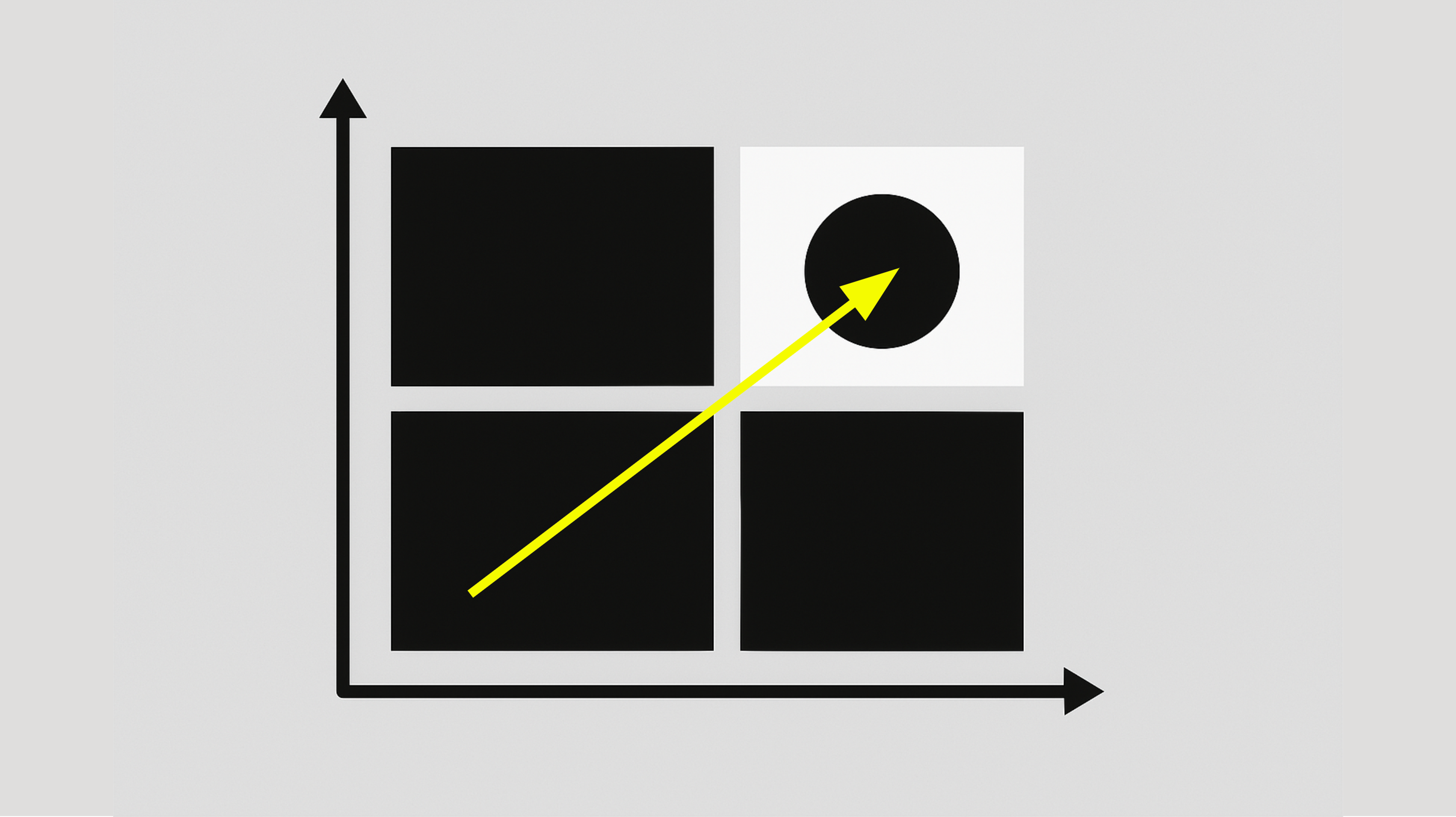 Når ingen elementer havner i øverste høyre kvadrant, bør målet være å bygge opp ett eller flere med tydelig potensial. Griden hjelper med å identifisere hvilket element som har høyest strategisk verdi – og som derfor bør prioriteres i videre eksponering, justering eller redesign.